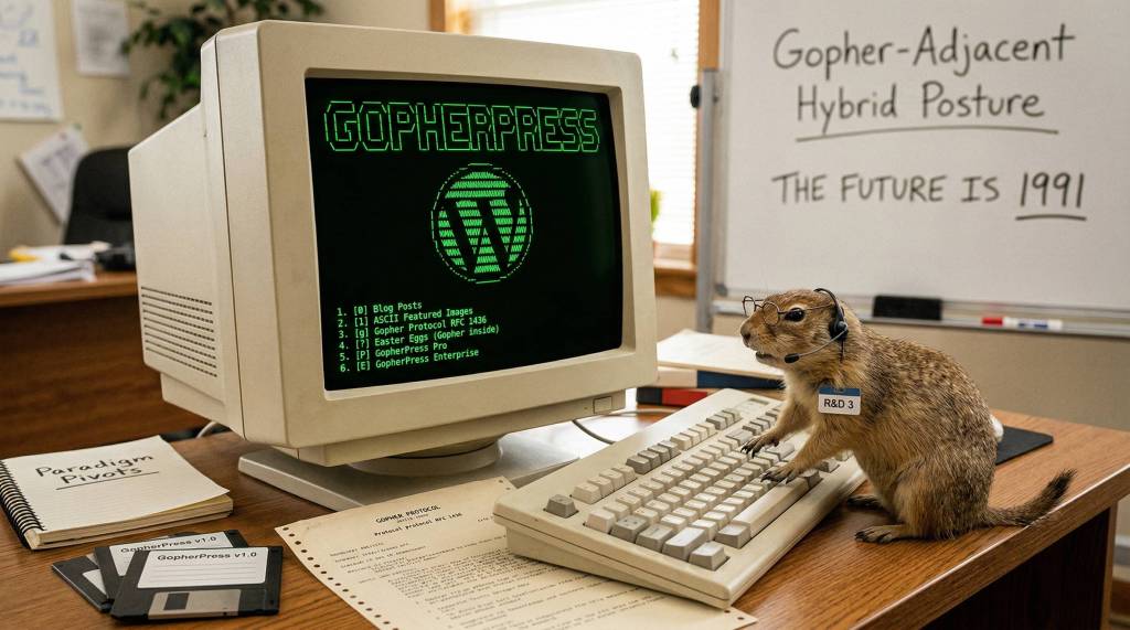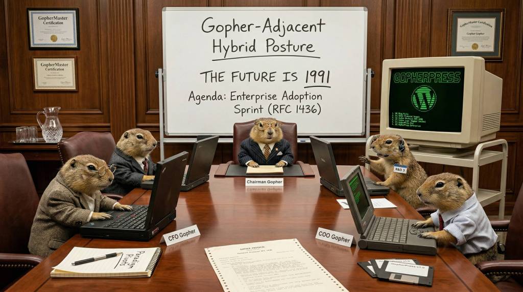 GopherPress is a product of Blarg Industries R&D 3. Blarg Industries is not responsible for any loss of HTTP traffic, confused users, or legacy Gopher clients that surface content you forgot you published in 2009. Gopher+ authentication support is real if you squint. The Gopher-Ready™ certificate is absolutely real if you pay for it.