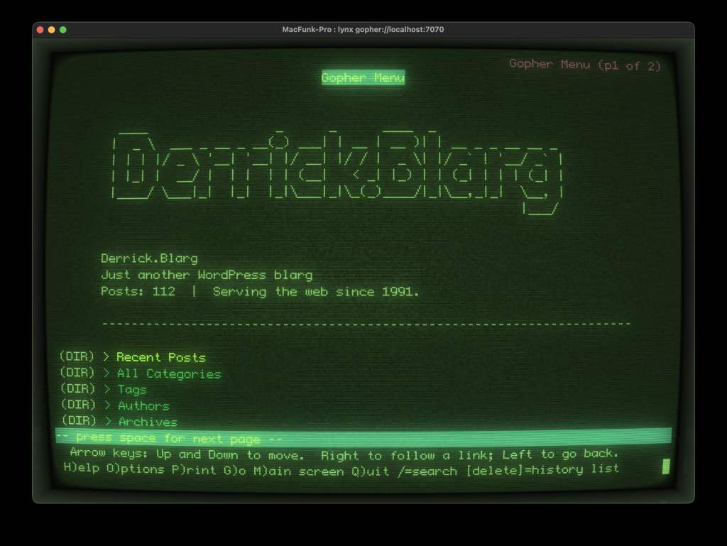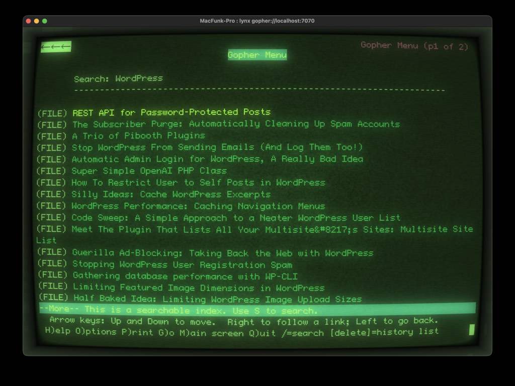 GopherPress is a WordPress plugin that spins up a real, live Gopher server alongside your existing web infrastructure. Your content: posts, pages, categories, archives–all of it, available on port 7070 via the Gopher protocol, rendered in beautiful, mission-critical plain text.
